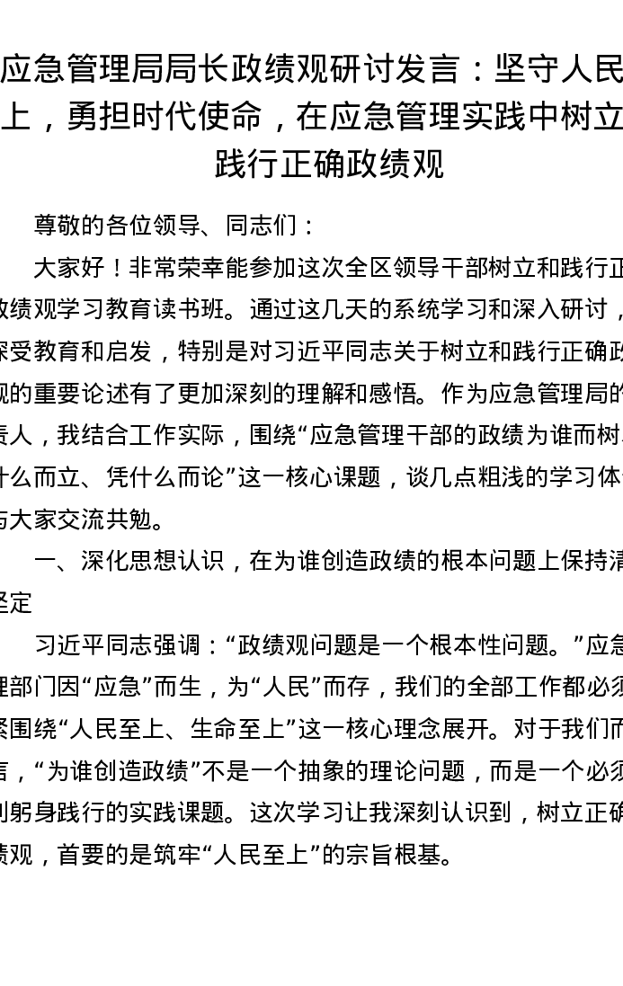 应急管理局局长ZJG研讨发言:坚守人民至上,勇担时代使命,在应急管理实践中树立和践行正确ZJG