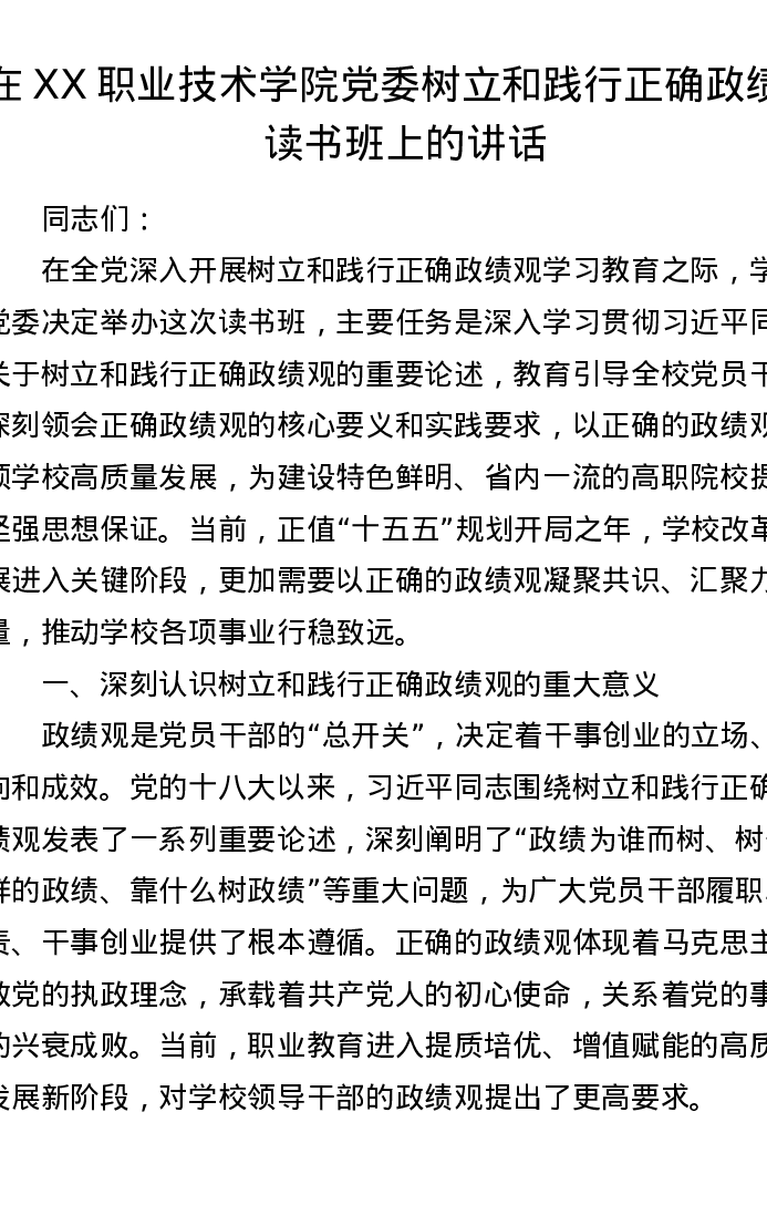 在 XX 职业技术学院党委树立和践行正确ZJG读书班上的讲话