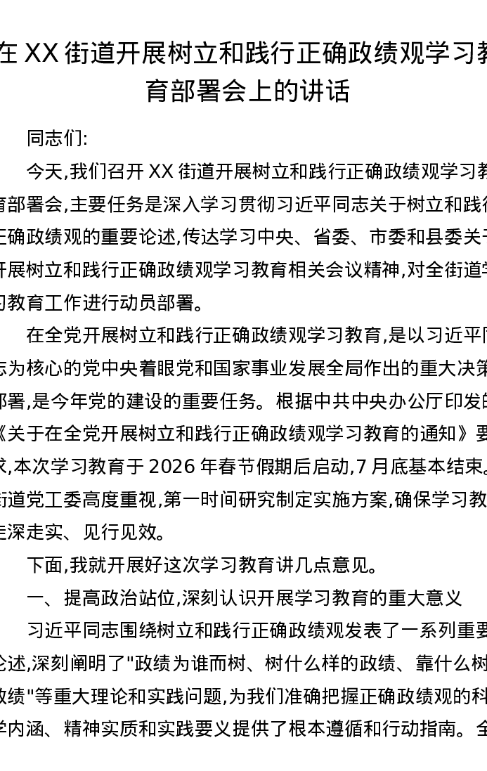 在XX街道开展树立和践行正确ZJG学习教育部署会上的讲话