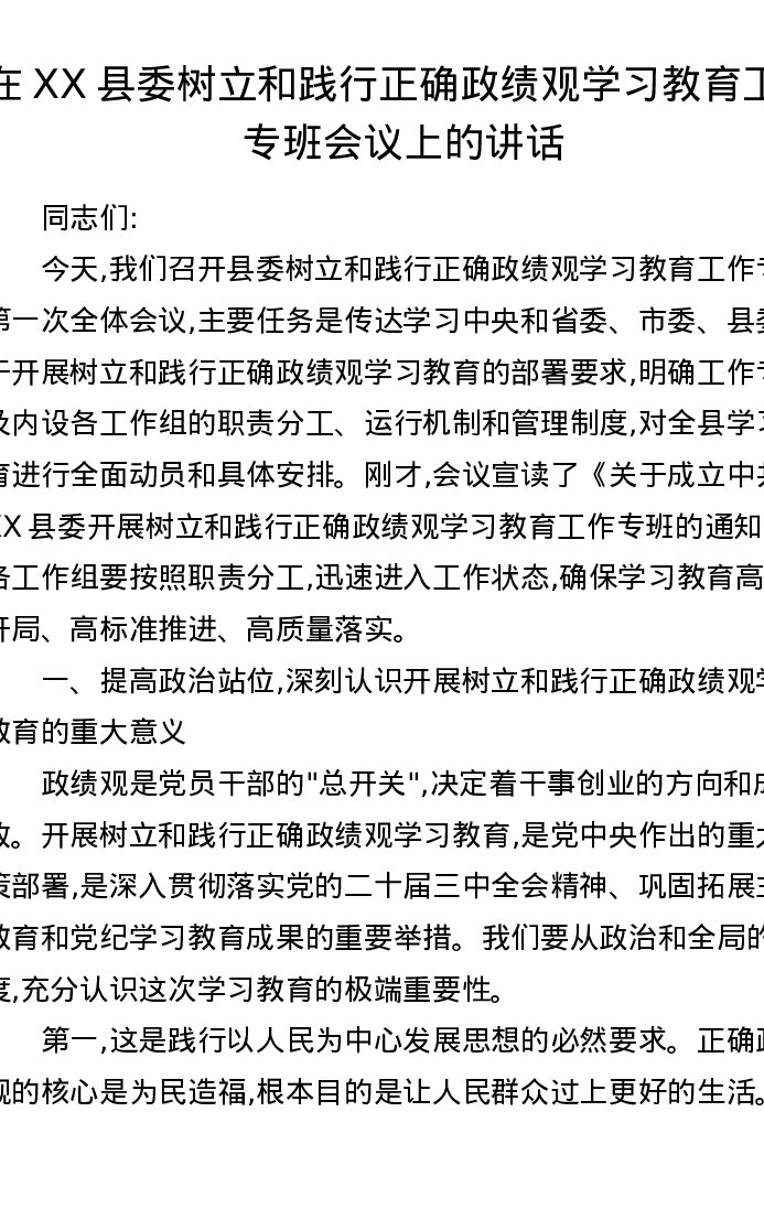在XX县委树立和践行正确ZJG学习教育工作专班会议上的讲话
