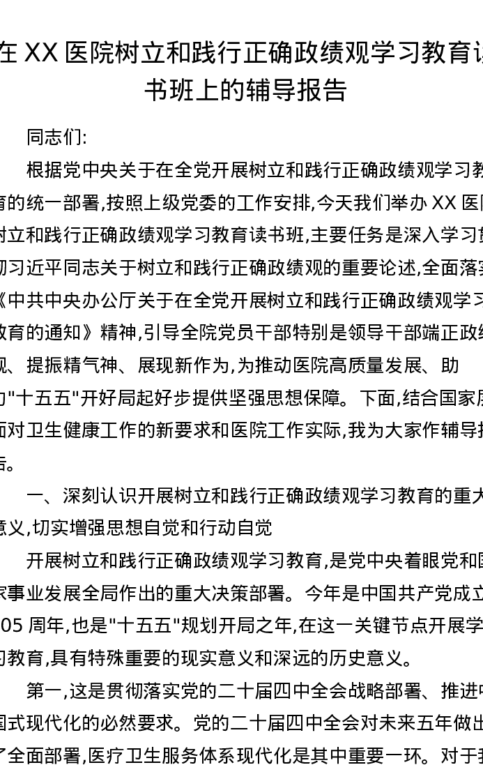 在XX医院树立和践行正确ZJG学习教育读书班上的辅导报告