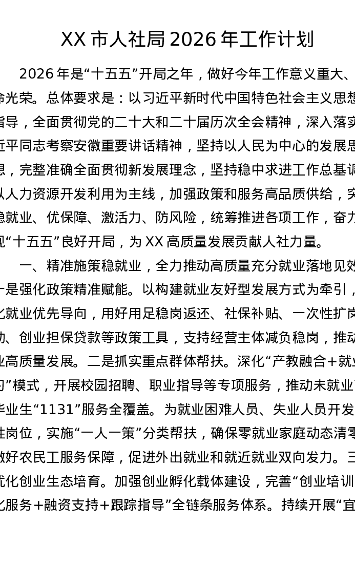 XX市人社局2026年工作计划