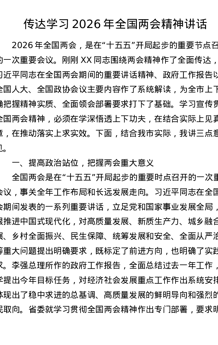传达学习2026年全国两会精神讲话