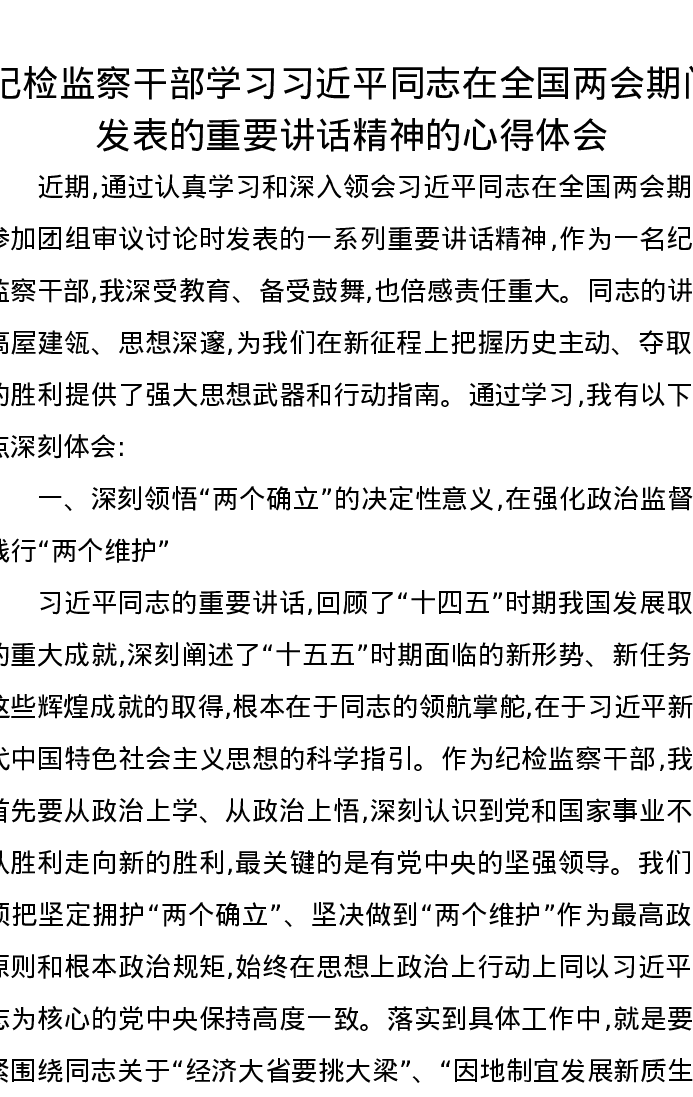 纪检监察干部学习习近平总书记在全国两会期间发表的重要讲话精神的心得体会