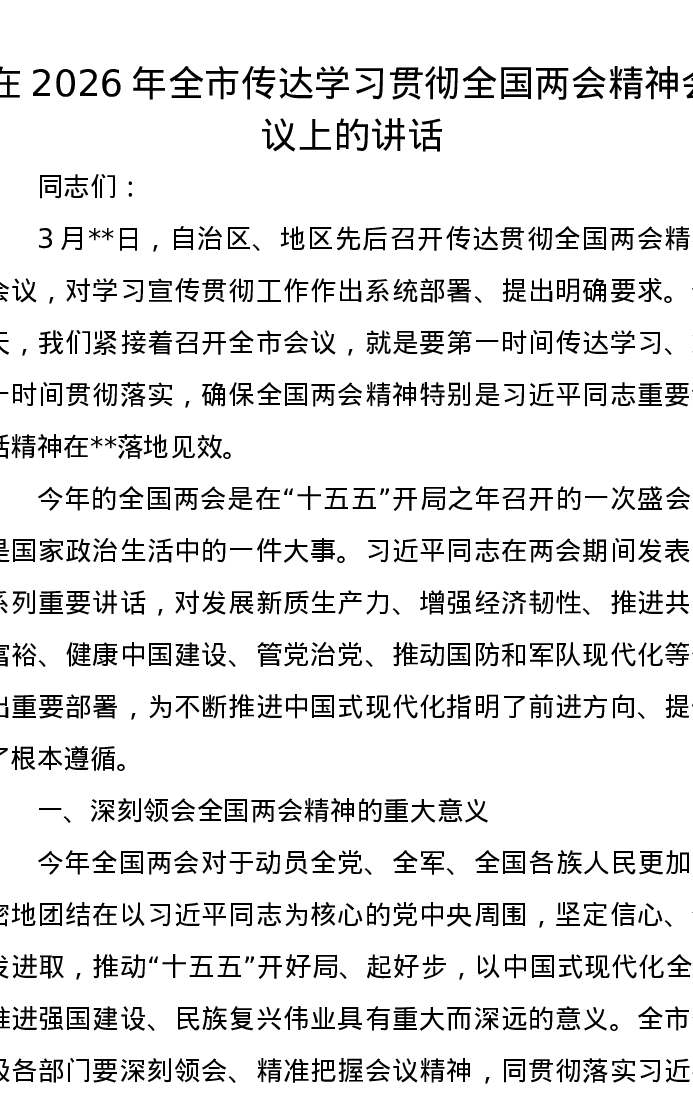 在2026年全市传达学习贯彻全国两会精神会议上的讲话