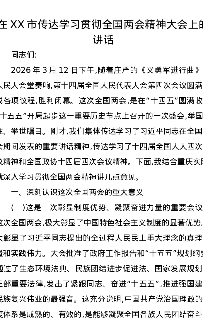 在XX市传达学习贯彻全国两会精神大会上的讲话