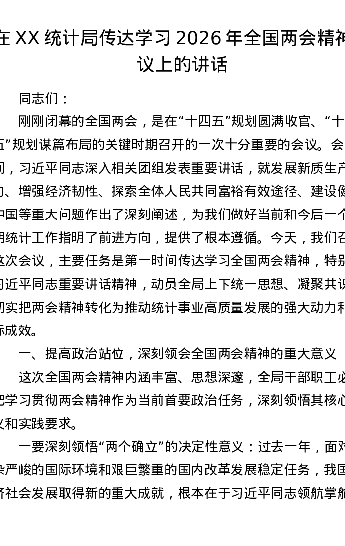 在XX统计局传达学习2026年全国两会精神会议上的讲话