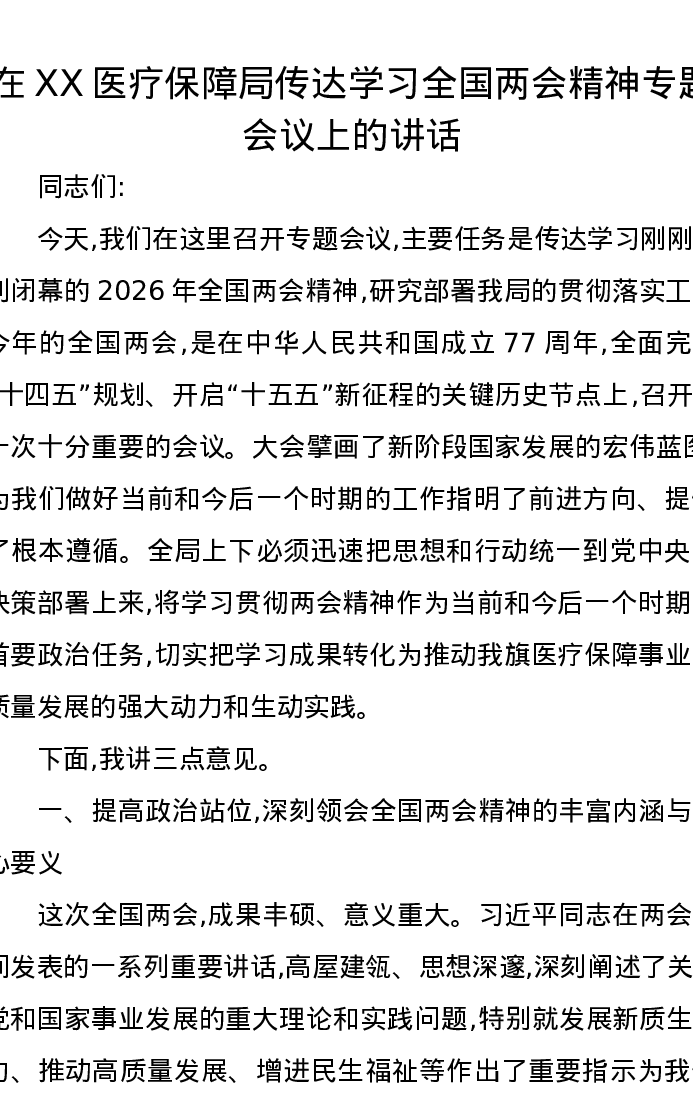 在XX医疗保障局传达学习全国两会精神专题会议上的讲话