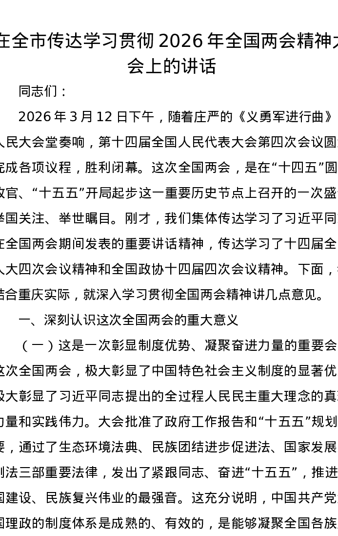 在全市传达学习贯彻2026年全国两会精神大会上的讲话