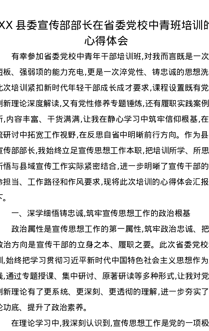 XX县委宣传部部长在省委党校中青班培训的心得体会
