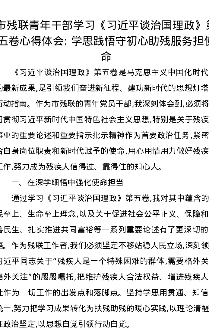 市残联青年干部学习《习近平谈治国理政》第五卷心得体会:学思践悟守初心助残服务担使命