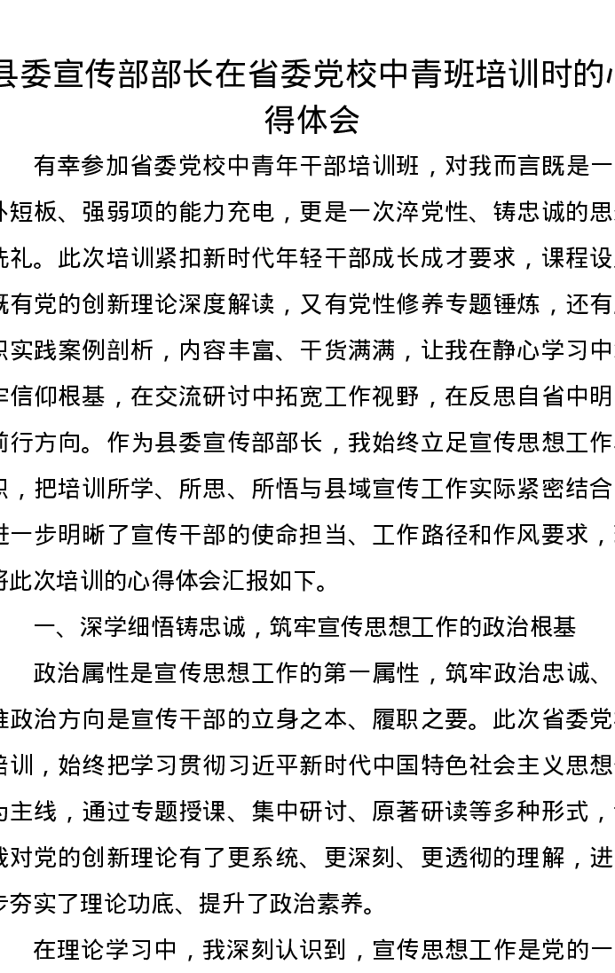 县委宣传部部长在省委党校中青班培训时的心得体会