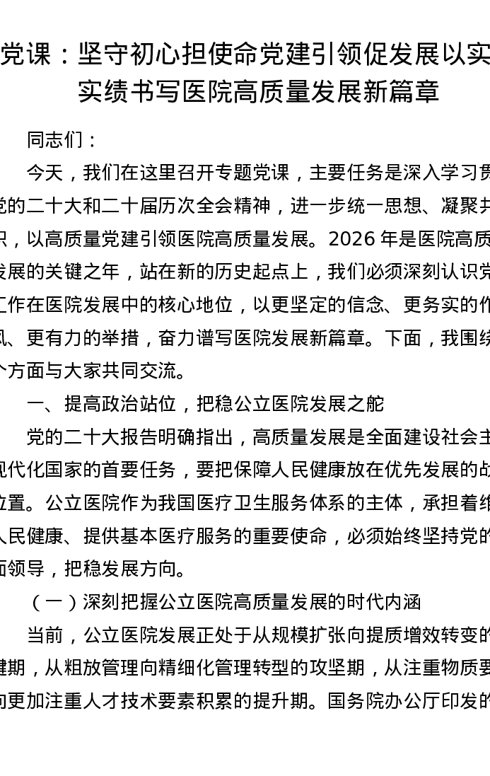党课:坚守初心担使命 党建引领促发展 以实干实绩书写医院高质量发展新篇章
