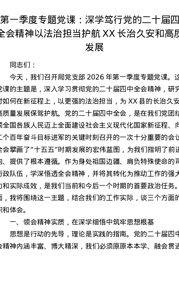 第一季度专题党课:深学笃行党的二十届四中全会精神以法治担当护航XX长治久安和高质量发展