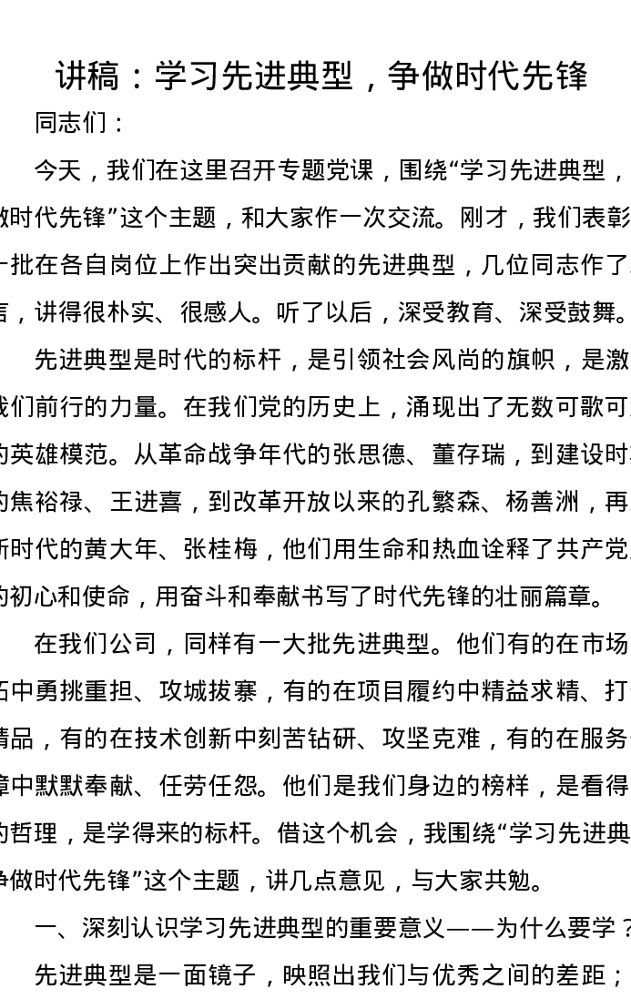 讲稿:学习先进典型,争做时代先锋