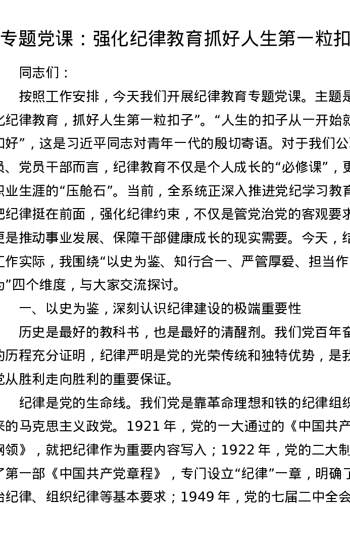 专题党课:强化纪律教育抓好人生第一粒扣子