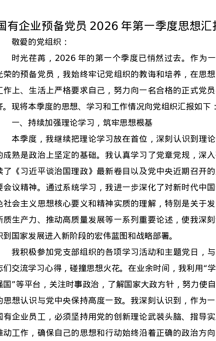 国有企业预备党员2026年第一季度思想汇报