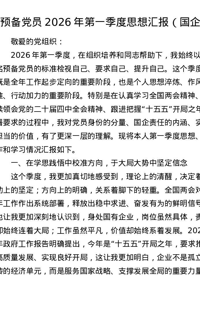 预备党员2026年第一季度思想汇报(国企)