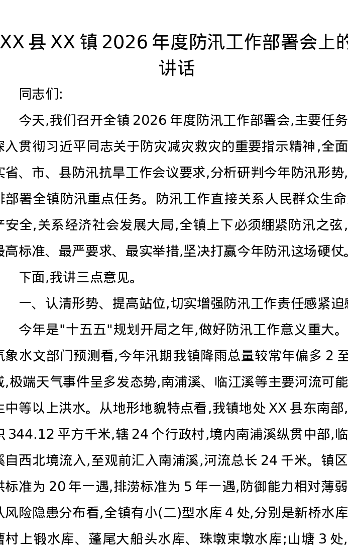 XX县XX镇2026年度防汛工作部署会上的讲话