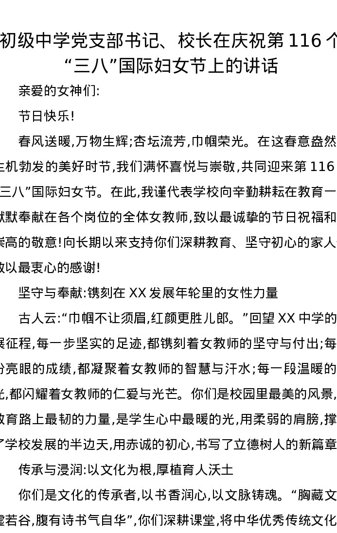 初级中学党支部书记、校长在庆祝第116个三八国际妇女节上的讲话