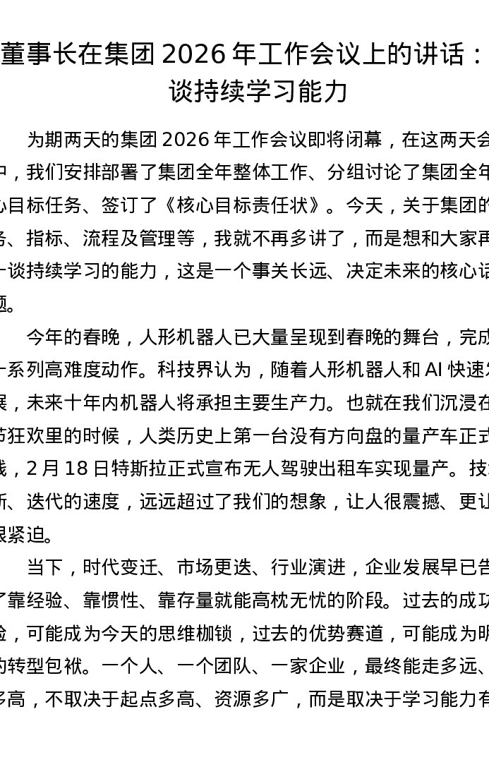 董事长在集团2026年工作会议上的讲话:再谈持续学习能力