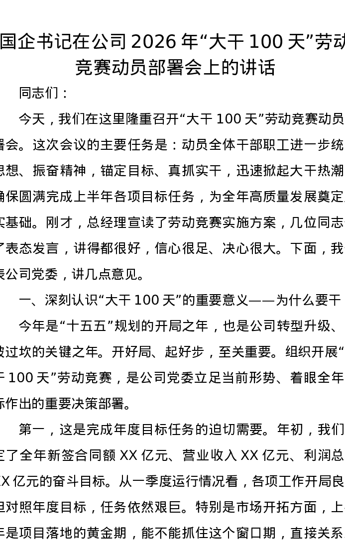 国企书记在公司2026年大干100天劳动竞赛动员部署会上的讲话