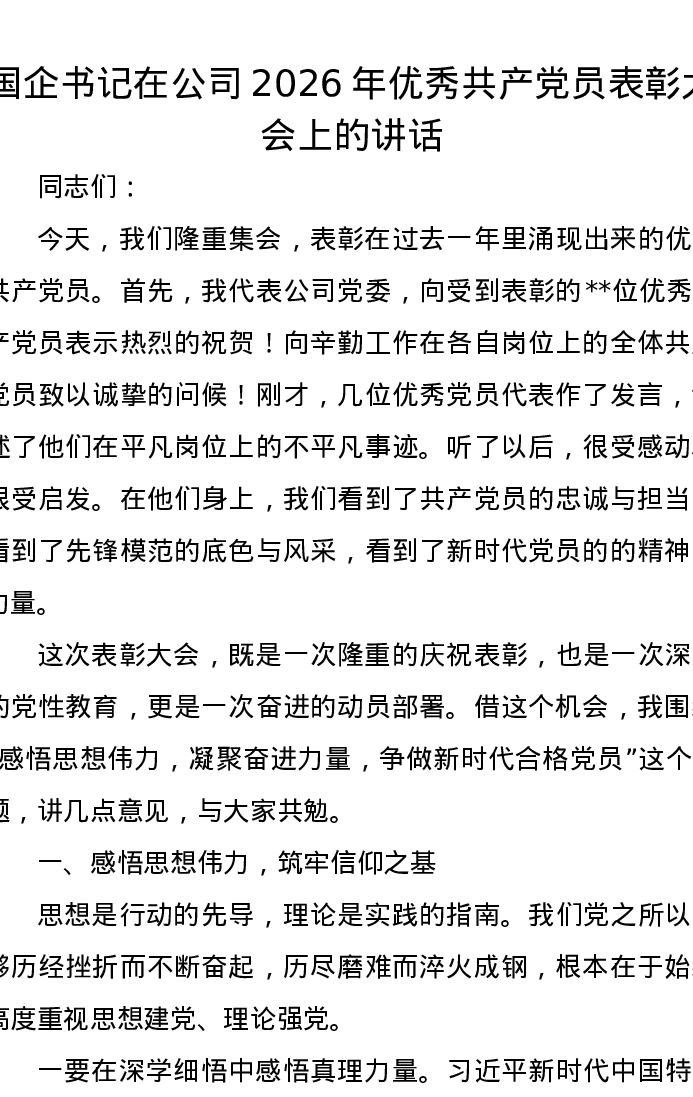 国企书记在公司2026年优秀共产党员表彰大会上的讲话