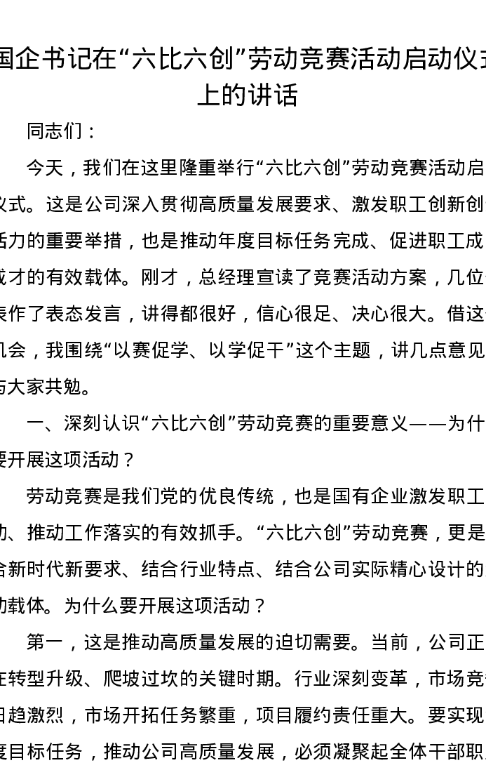 国企书记在六比六创劳动竞赛活动启动仪式上的讲话