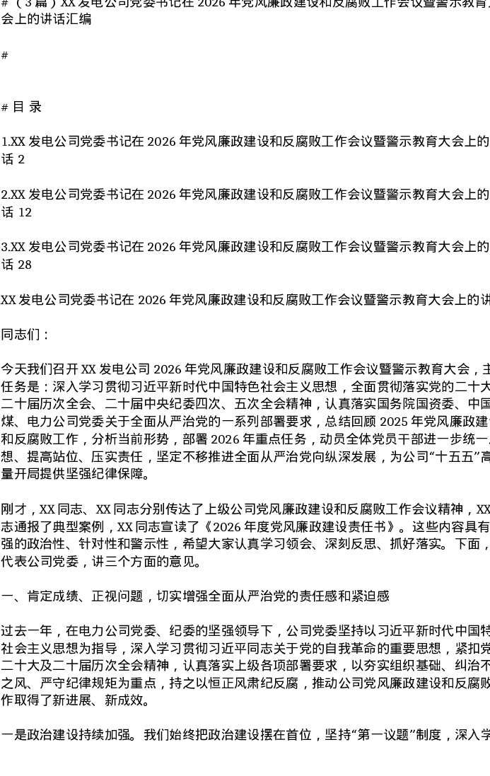 汇编:XX发电公司党委书记在2026年党风廉政建设和反腐败工作会议暨警示教育大会上的讲话3篇