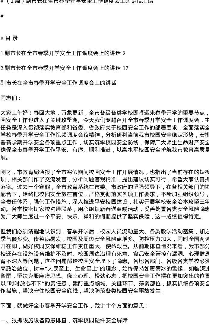 汇编:副市长在全市春季开学安全工作调度会上的讲话2篇