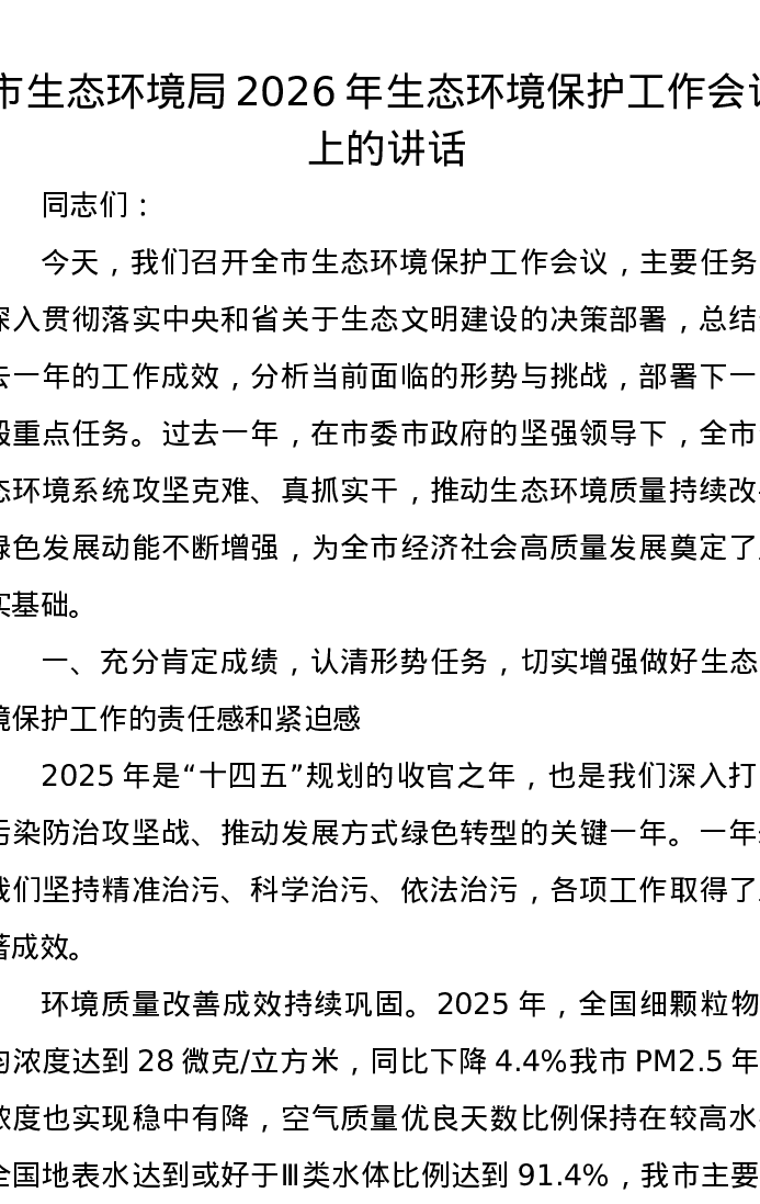 市生态环境局2026年生态环境保护工作会议上的讲话