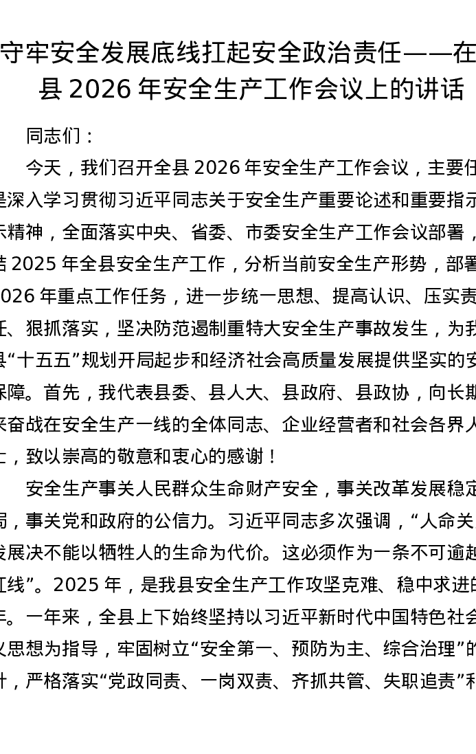 守牢安全发展底线 扛起安全政治责任——在全县2026年安全生产工作会议上的讲话