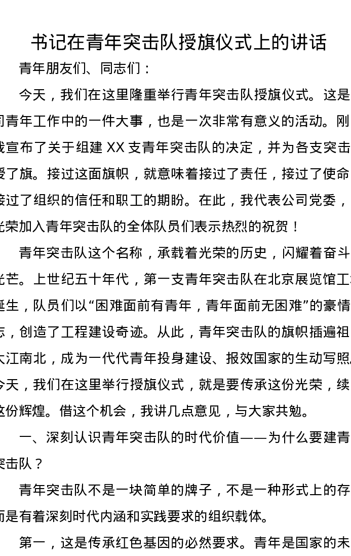 书记在青年突击队授旗仪式上的讲话