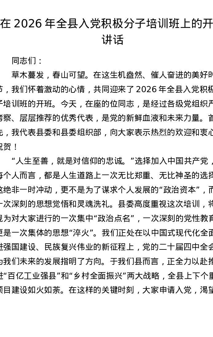 在 2026 年全县入党积极分子培训班上的开班讲话