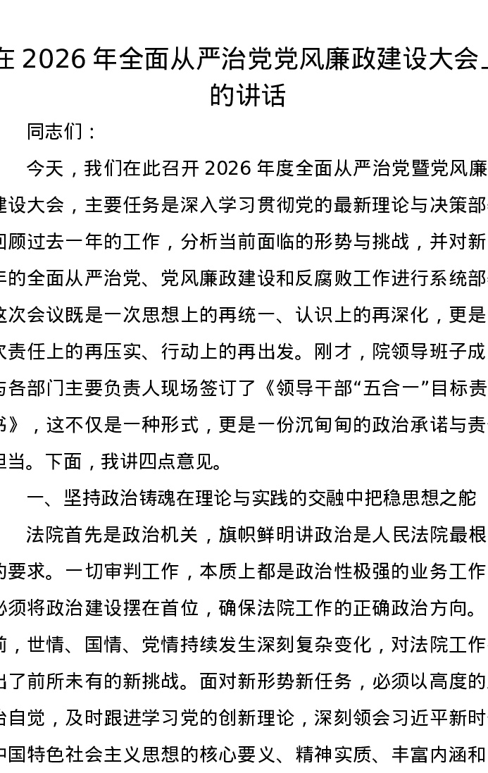 在2026年全面从严治党党风廉政建设大会上的讲话