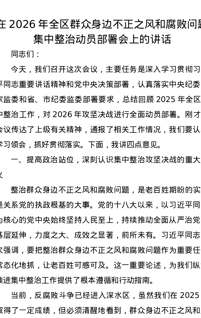 在2026年全区群众身边不正之风和腐败问题集中整治动员部署会上的讲话