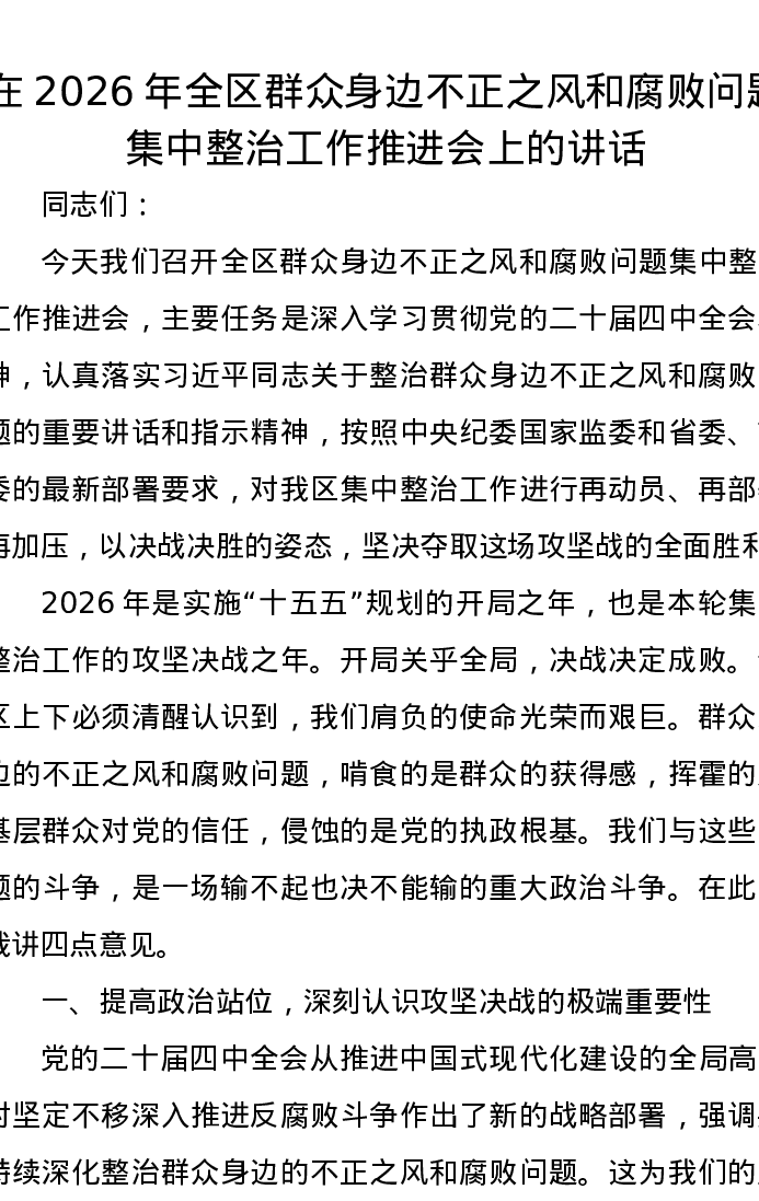 在2026年全区群众身边不正之风和腐败问题集中整治工作推进会上的讲话