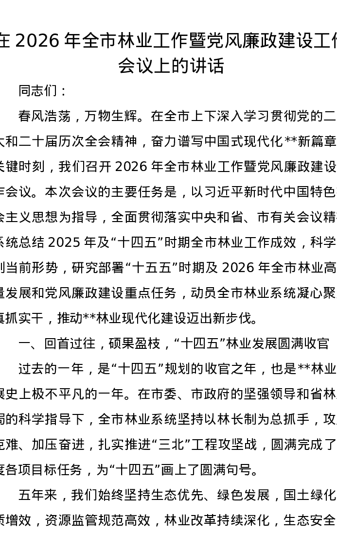 在2026年全市林业工作暨党风廉政建设工作会议上的讲话
