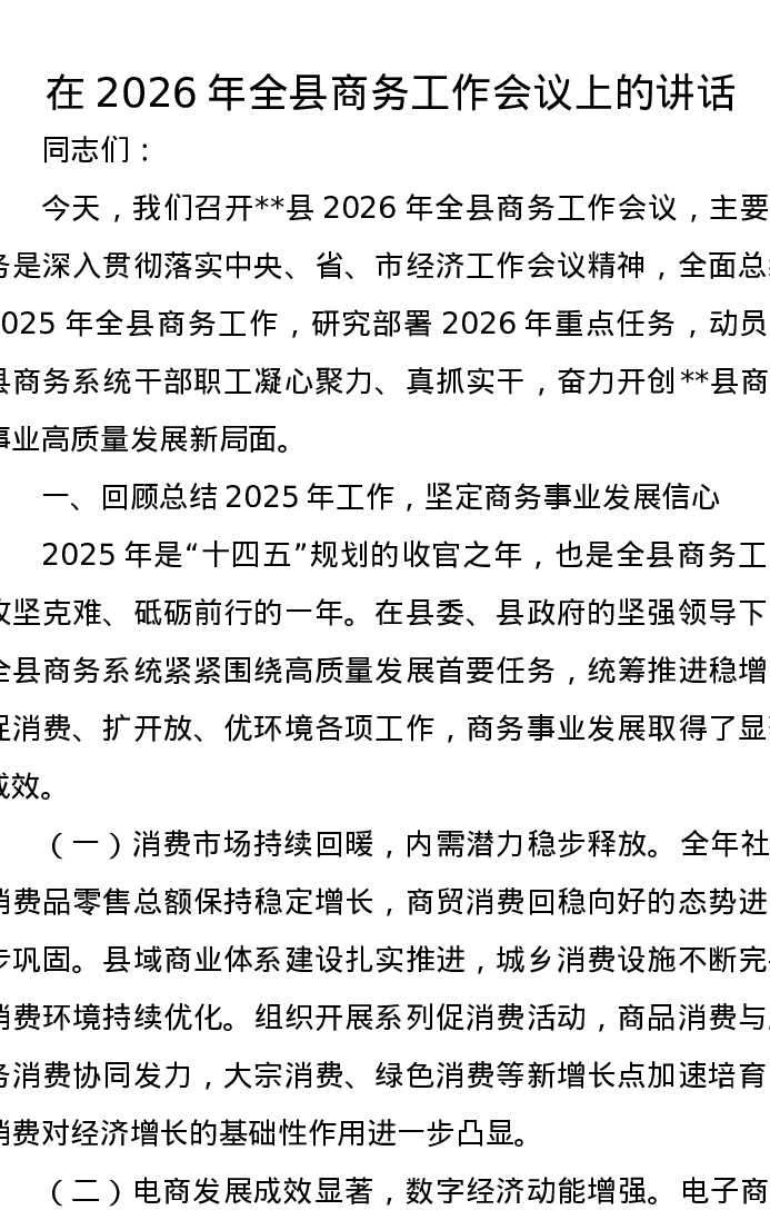 在2026年全县商务工作会议上的讲话
