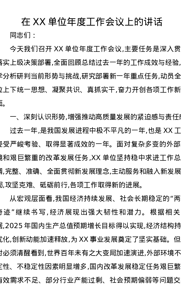 在XX单位年度工作会议上的讲话