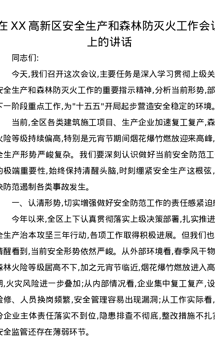 在XX高新区安全生产和森林防灭火工作会议上的讲话