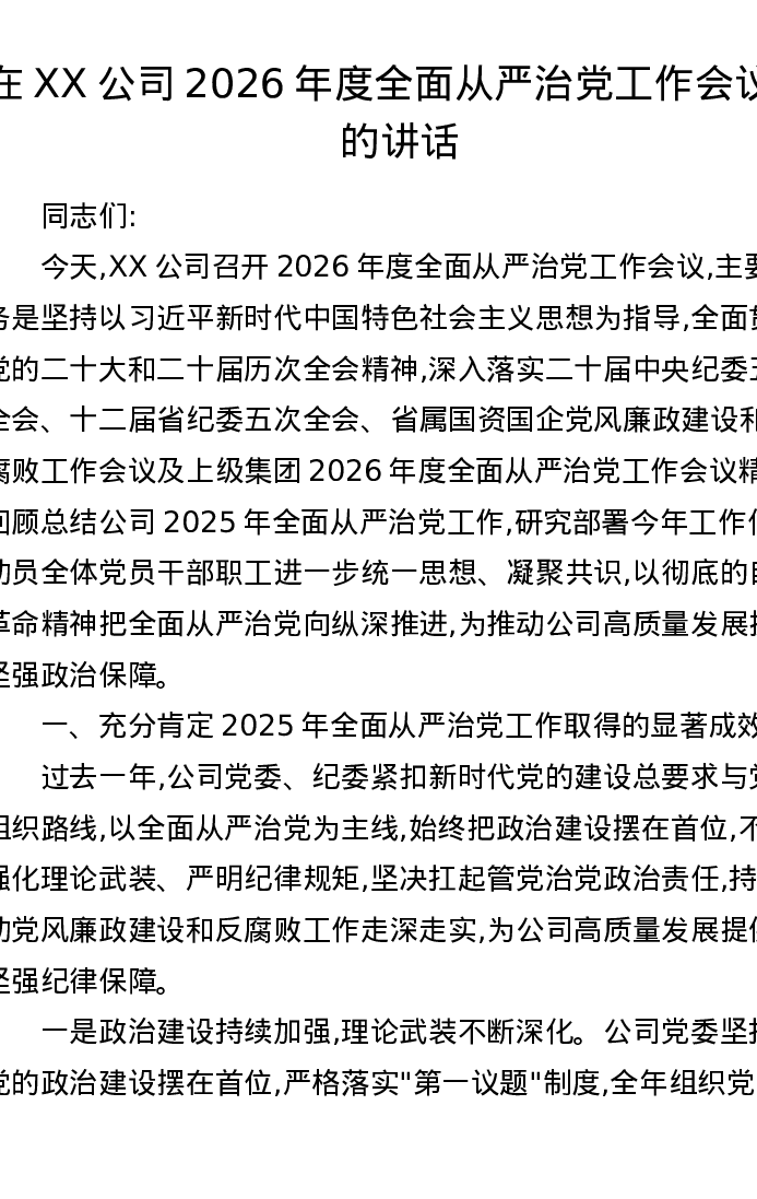 在XX公司2026年度全面从严治党工作会议上的讲话