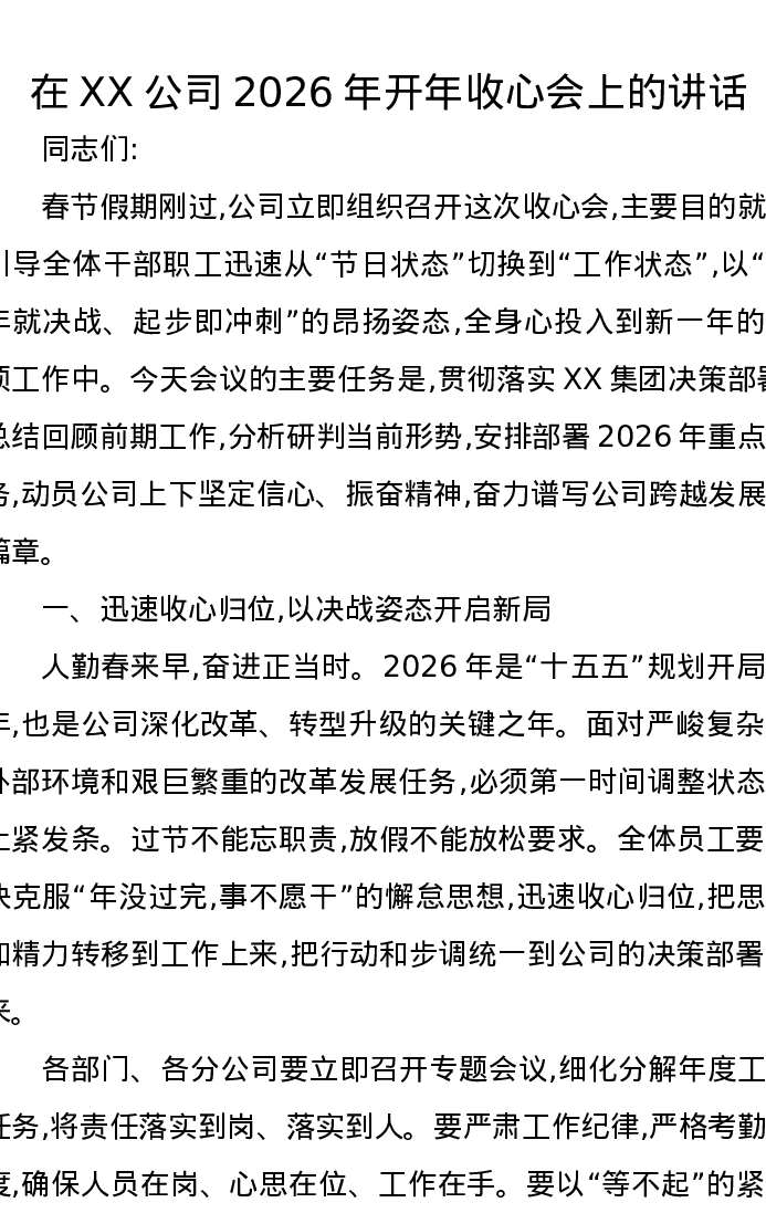 在XX公司2026年开年收心会上的讲话