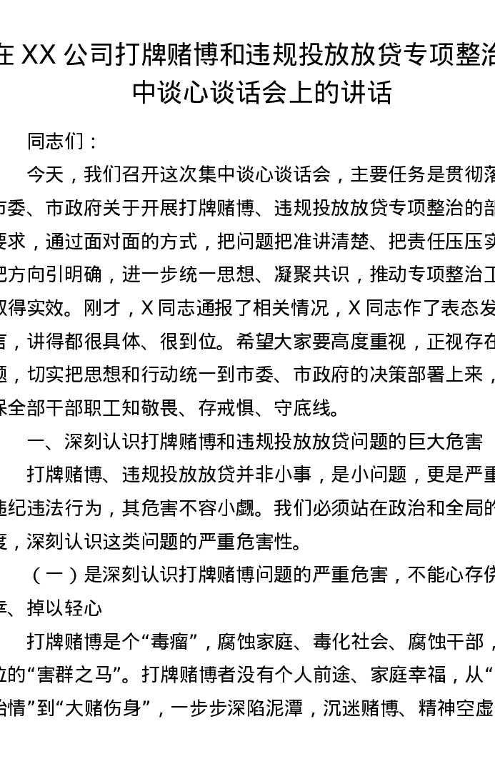 在XX公司打牌赌博和违规投放放贷专项整治集中谈心谈话会上的讲话