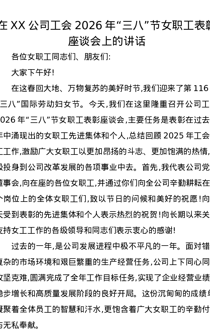 在XX公司工会2026年三八节女职工表彰座谈会上的讲话