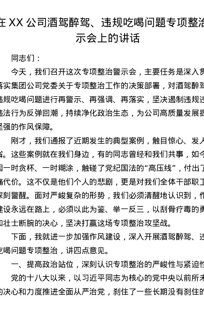 在XX公司酒驾醉驾、违规吃喝问题专项整治警示会上的讲话