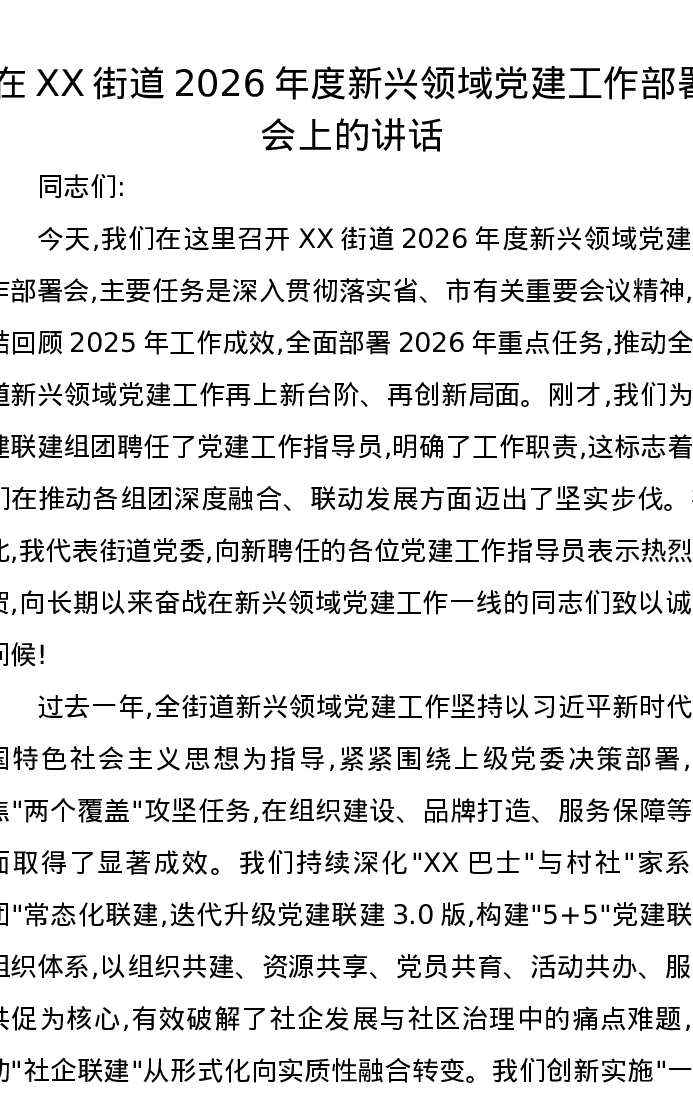 在XX街道2026年度新兴领域党建工作部署会上的讲话