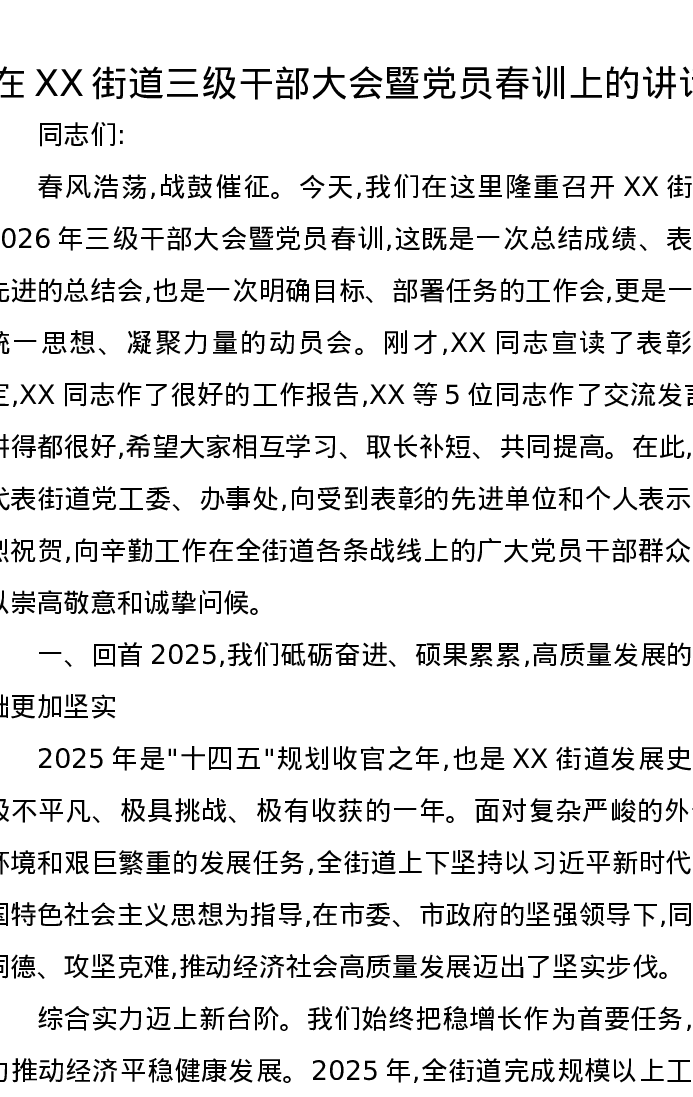 在XX街道三级干部大会暨党员春训上的讲话