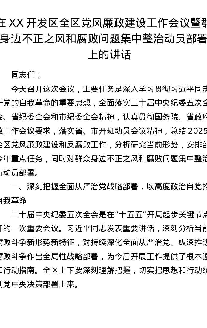 在XX开发区全区党风廉政建设工作会议暨群众身边不正之风和腐败问题集中整治动员部署会上的讲话