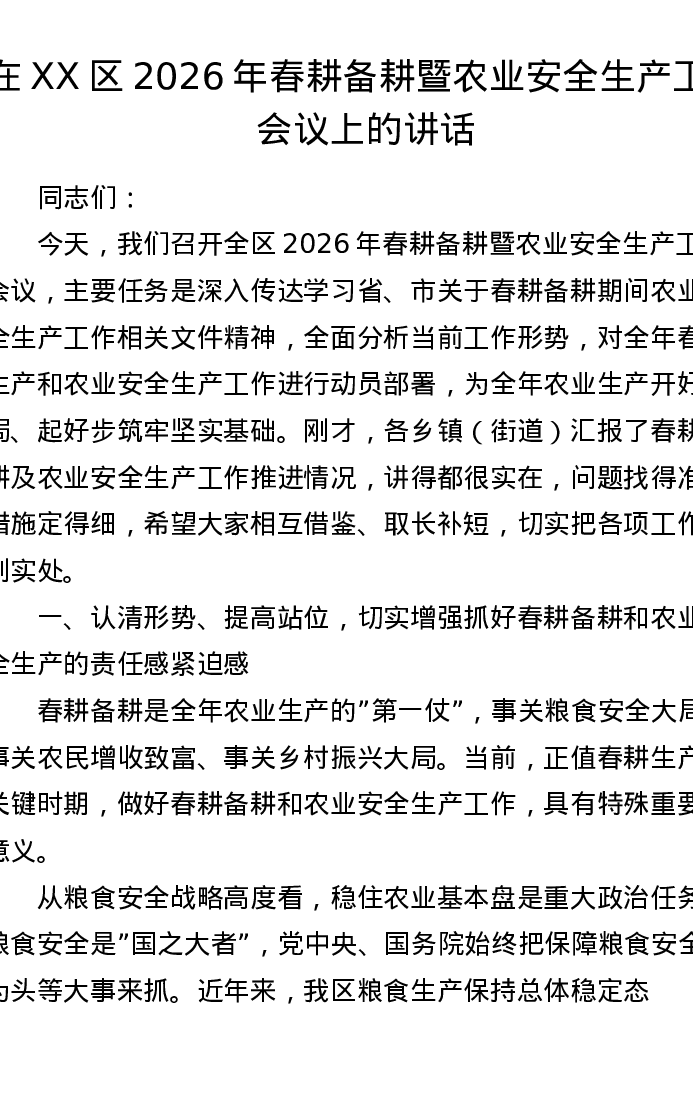 在XX区2026年春耕备耕暨农业安全生产工作会议上的讲话